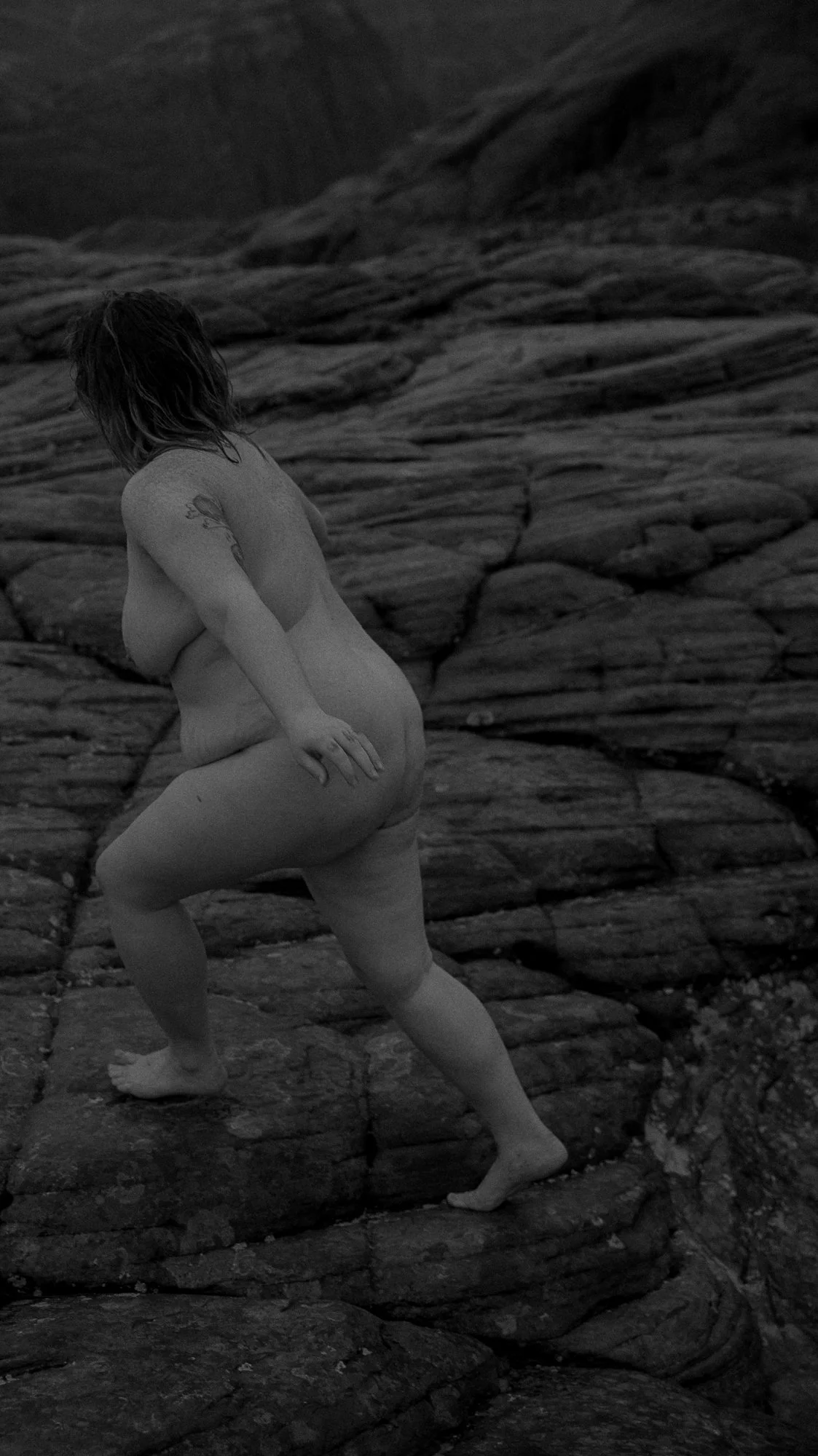 It was cold and felt hurried and wild with floods of shape making and inspiration with, miraculously, no one around. There were plenty of places to go and hunker for the kind of privacy that’s sometimes needed for nudes in nature, but nature gave us a storm for privacy so we climbed up. Up through puddles, wind whipping, screaming directions and laughing,